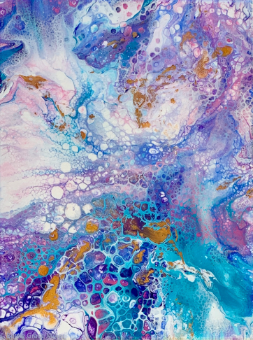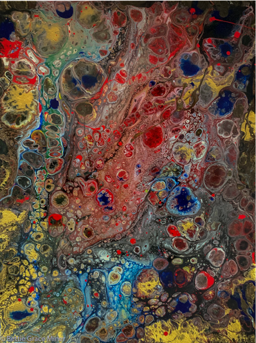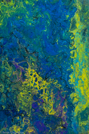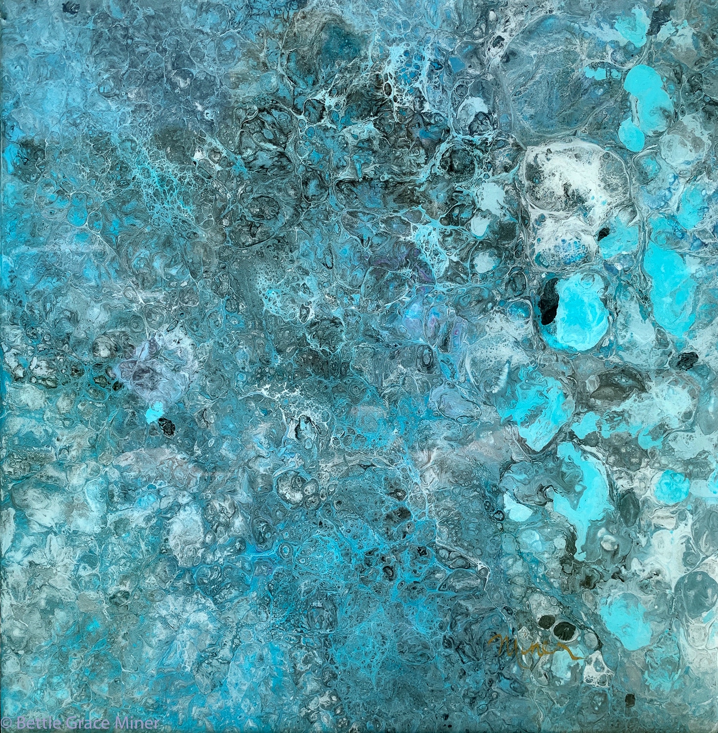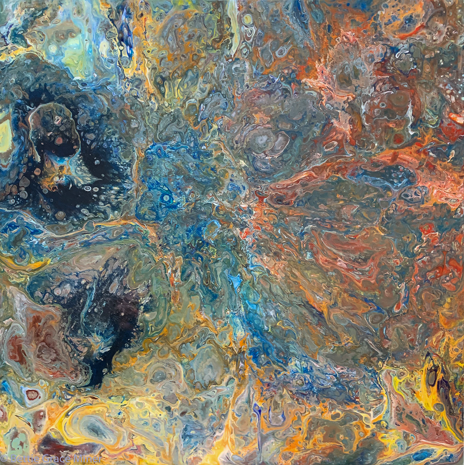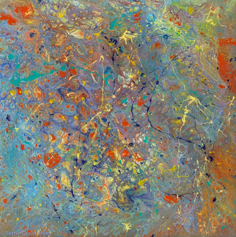 Images in this collection were created with acrylic paints and mediums on either canvas or cradled hard board. Many of the pieces are framed in a simple black floater frame.