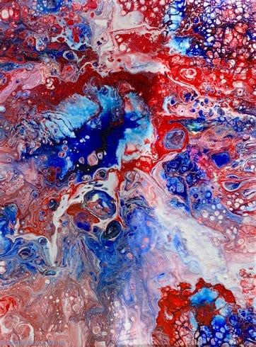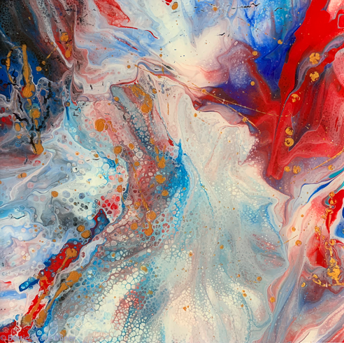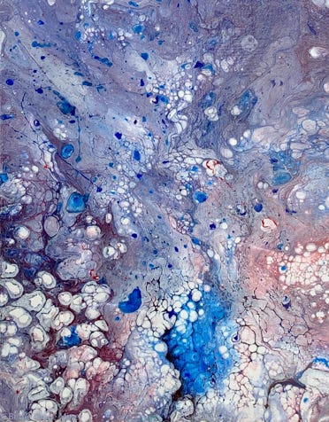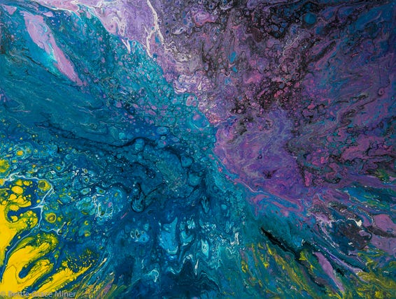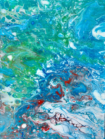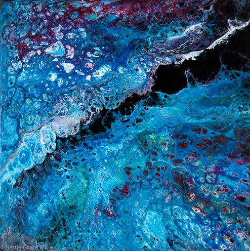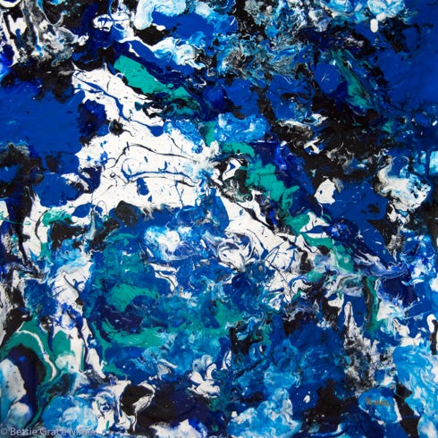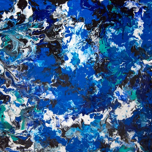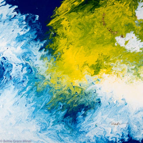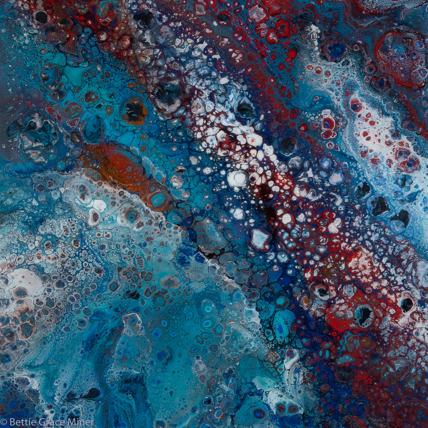 Images in this collection were created with acrylic paints and mediums on either canvas or cradled hard board. Many of the pieces are framed in a simple black floater frame.
