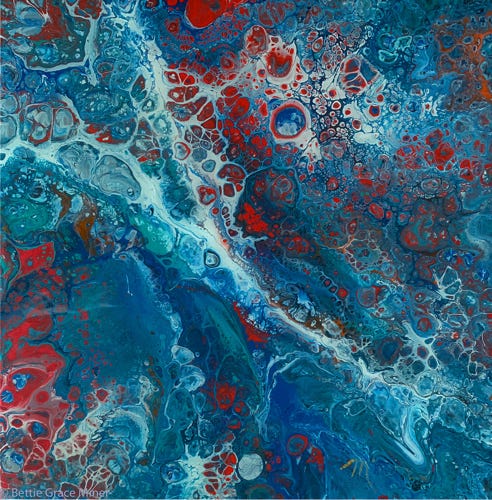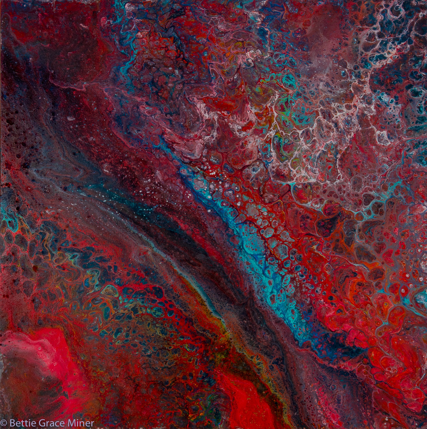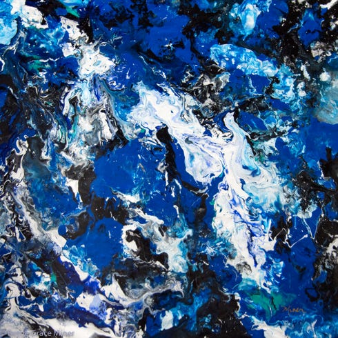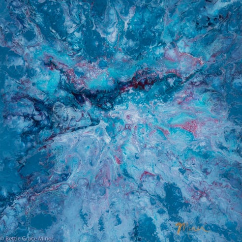 Images in this collection were created with acrylic paints and mediums on either canvas or cradled hard board. Many of the pieces are framed in a simple black floater frame.
